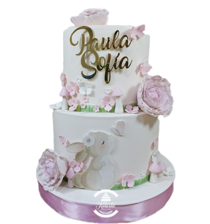 Torta de 18cm y 24cm x 15cm de altura(50 porciones) con doble relleno cada piso. Preforrada con ganache de chocolate y forrada en masa fondant. Impresión de conejita en papel comestible. Flores, hongos y mariposas elaboradas en pasta de goma comestible. Topper personalizado en acrílico dorado.