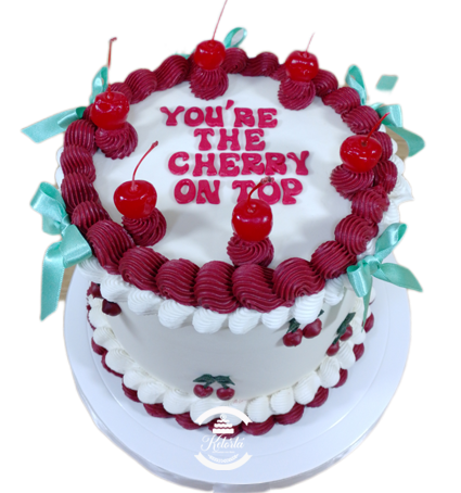 Torta red velvet 20cm x 12cm (20 porciones) doble relleno de fudge. Preforrada con ganache de chocolate. Cubierta en buttercream americano, nombre personalizado en masa comestible. Decorada con 6 cerezas y lazos satinados.