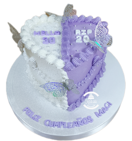 Torta corazón 16cm para 12 porciones con doble relleno. Cubierta elaborada en crema buttercream americano. Mariposas plateadas, nombre personalizado. Decoración con escarcha y perlas comestibles.