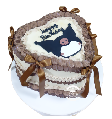 Torta corazón 18cm para (15 porciones) con doble relleno. Cubierta elaborada en crema buttercream americano. Cara de Kuromi elaborada en masa, frase personalizado. Decoración con lazos satinados.