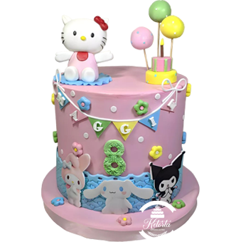 Torta alta de 22cm x 18cm de altura(35 porciones). Preforrada con ganache de chocolate, forrada en masa fondant. Modelado de hello kitty en diseño 3D y detalles adicionales elaborados en masa.