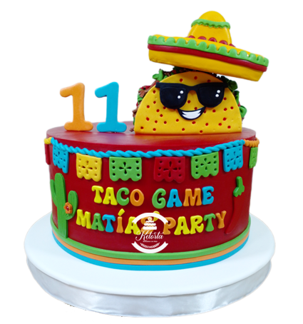 Torta de 26cm de diámetro x 15cm de altura (35 porciones). Doble relleno. Preforrada con ganache de chocolate, forrada en masa fondant. Taco y sombrero con base de tecnopor forrados en masa y detalles adicionales elaborados en masa.