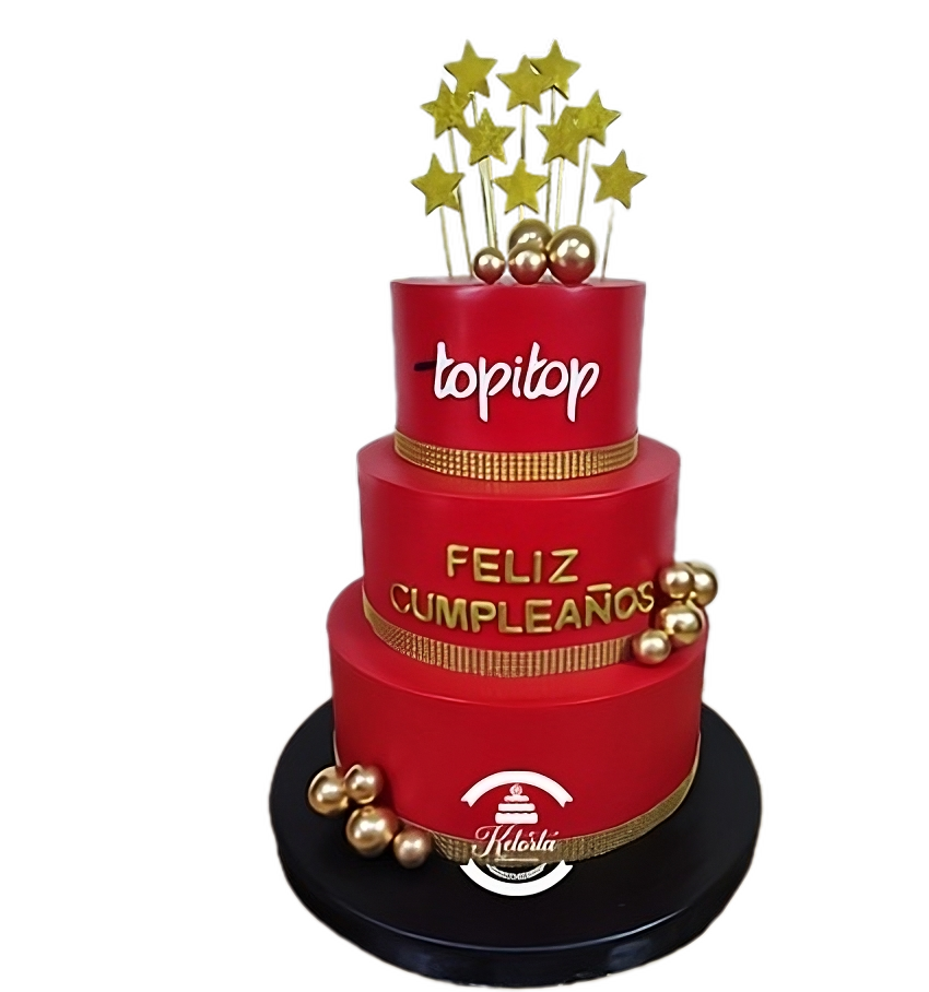 Maqueta de 3 pisos tamaños: 18cm, 24cm y 30cm. Forradas en masa fondant. Decorada con estrellas elaboradas en masa, esfera doradas y logo personalizado.